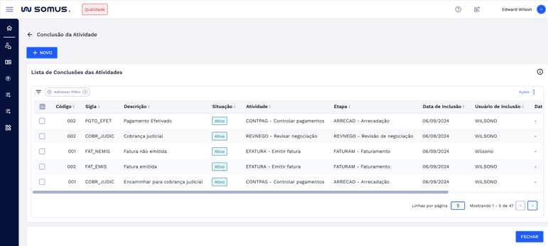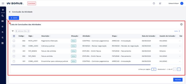 Ao clicar na opção “Conclusão da atividade”, você será direcionado para a tela de visualização da lista de conclusões das atividades. Nessa tela, é possível consultar as conclusões cadastradas por meio de uma tabela organizada com colunas como: código, sigla, descrição, situação, atividade, etapa, datas de inclusão e atualização, além dos respectivos usuários responsáveis.