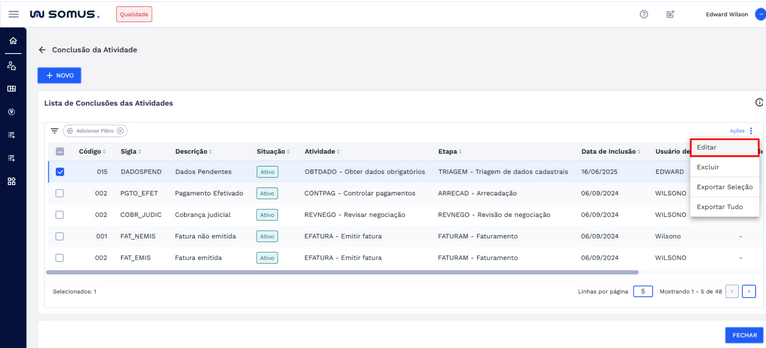 Para editar uma conclusão de atividade cadastrada, primeiro localize o registro desejado na lista. Em seguida, selecione a conclusão de atividade e clique no botão “Ações”.