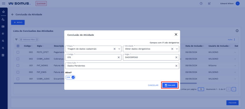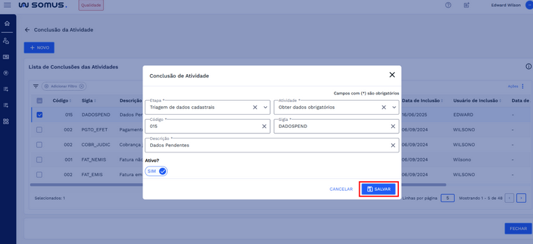 Quando os campos forem preenchidos, o botão “SALVAR” será habilitado para finalizar o cadastro. Caso deseje cancelar a operação, clique em “CANCELAR” para retornar à lista de conclusões das atividades sem salvar as informações.