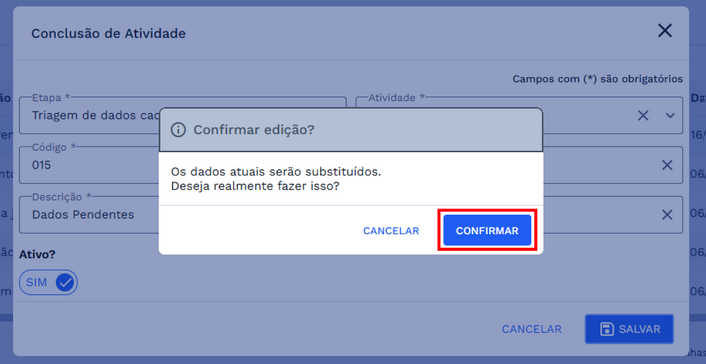 Após clicar em “SALVAR”, o sistema exibirá uma caixa de diálogo solicitando a confirmação da edição. Para concluir a atualização, clique em “CONFIRMAR”. Caso desista da alteração, clique em “CANCELAR” para interromper a ação e manter os dados anteriores. Confira o exemplo na imagem abaixo: