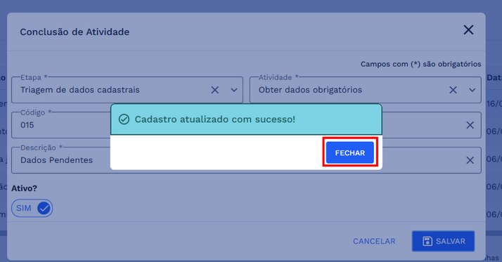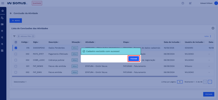 Clique em “FECHAR” para retornar para lista de conclusões das atividades.