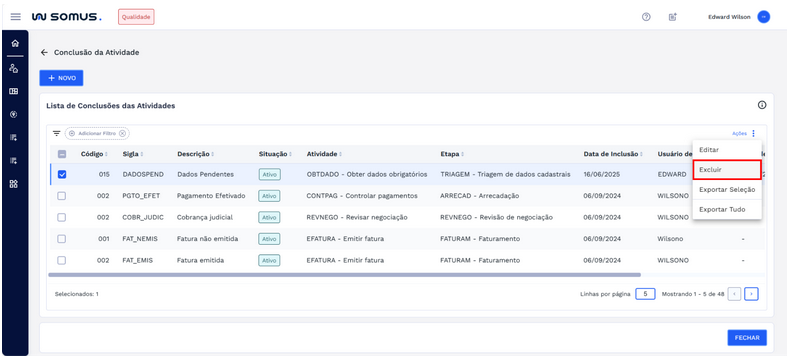 Para excluir uma conclusão de atividade cadastrada, primeiro localize o registro desejado na lista. Em seguida, selecione a conclusão de atividade e clique no botão “Ações”.