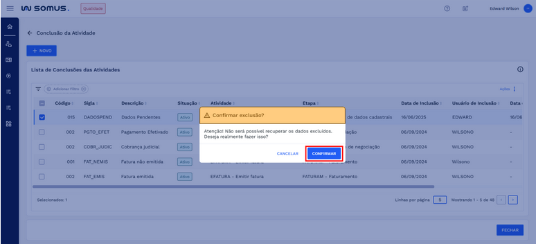 Para concluir a exclusão, clique em “CONFIRMAR”. Caso prefira cancelar o processo, clique em “CANCELAR”. Confira o exemplo na imagem abaixo: