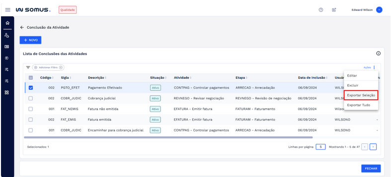 Para exportar registros específicos, selecione apenas uma conclusão de atividade por vez na lista, marcando a caixa correspondente. Em seguida, clique no botão “Ações” e escolha a opção “Exportar Seleção”.