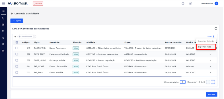 Na lista de conclusões das atividades, é possível exportar os dados disponíveis para um arquivo, facilitando consultas externas ou registros fora do sistema. Há duas opções de exportação: