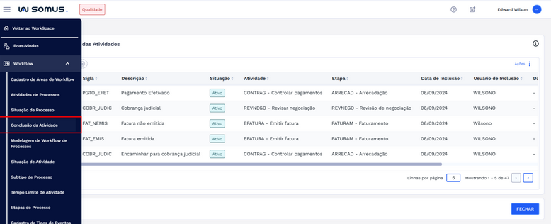 | Workflow | Visualizar lista das conclusões das atividades cadastradas |