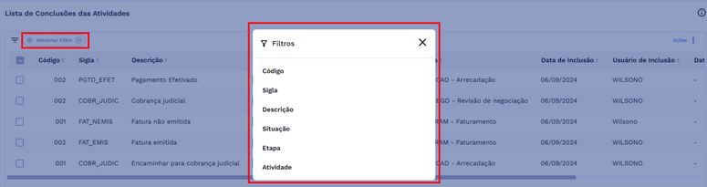 Adicionar Filtro: Ao clicar em Adicionar Filtro, são exibidas as opções de filtros disponíveis para a tabela. Após preencher os valores e confirmar, o filtro é aplicado e a lista é atualizada conforme os critérios informados.