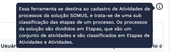 Info: O símbolo ⓘ no card da lista de atividades de processos indica a presença de informação complementar. Ao passar o cursor sobre o ícone, o sistema exibe orientações úteis sobre a seção correspondente.