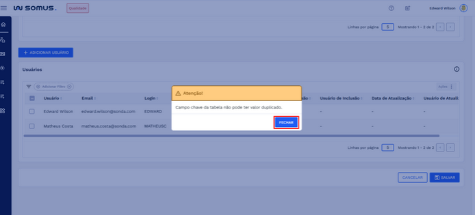 Para prosseguir com o cadastro, é necessário corrigir o valor informado no campo indicado e garantir que ele seja único. Após o ajuste, basta clicar novamente em “SALVAR”.