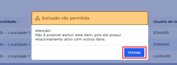 Nesses casos, ao confirmar a exclusão, será exibida a seguinte mensagem de validação: