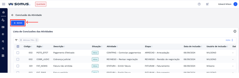 Para cadastrar uma nova conclusão de atividade, clique no botão “+ NOVO” do lado esquerdo da tela.