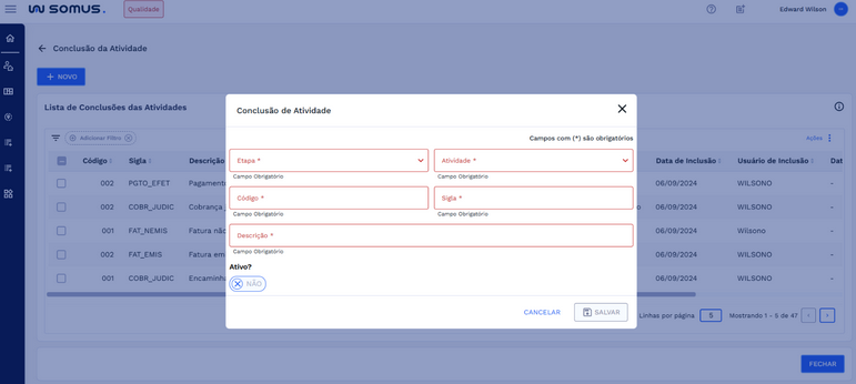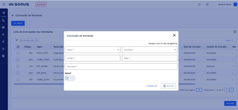 Importante: Para cadastrar uma conclusão de atividade, é obrigatório vincular uma etapa e uma atividade previamente cadastradas em suas respectivas aplicações. Nesta tela, a escolha da atividade só é possível após a seleção da etapa correspondente.