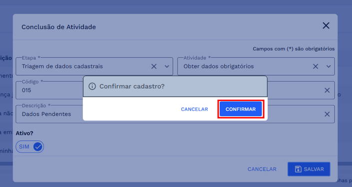 Clique em “SALVAR”, na sequência o sistema apresentará uma caixa de diálogo solicitando a confirmação do cadastro, para avançar clique em “Confirmar” e caso deseje retornar clique em “CANCELAR”, confira na imagem abaixo: