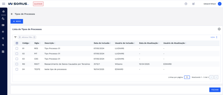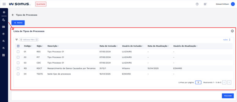 Essa aplicação tem como finalidade o cadastro e gerenciamento dos Tipos de Processo utilizados na solução SOMUS. Por meio dela, é possível incluir, editar, excluir, visualizar e exportar os tipos cadastrados. Os Tipos de Processo organizam os fluxos de atividades executados no sistema e podem estar vinculados a Subtipos.