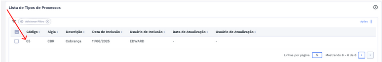 Após o cadastro ser realizado com sucesso os dados serão apresentados na lista de tipos de processos, conforme imagem abaixo: