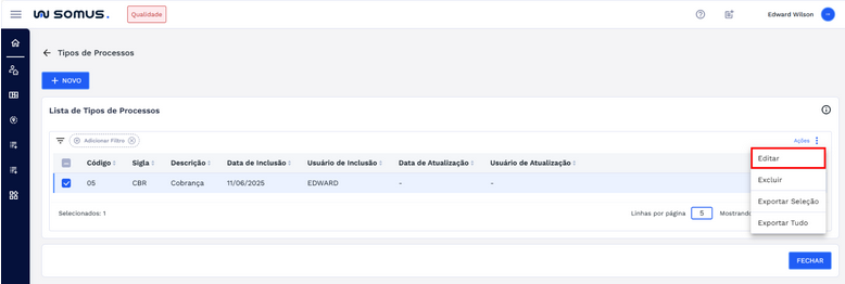 Para editar um tipo de processo cadastrado, primeiro localize o registro desejado na lista. Em seguida, selecione o tipo de processo e clique no botão “Ações”.