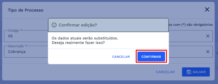 Após clicar em “SALVAR”, o sistema exibirá uma caixa de diálogo solicitando a confirmação da edição. Para concluir a atualização, clique em “CONFIRMAR”. Caso desista da alteração, clique em “CANCELAR” para interromper a ação e manter os dados anteriores. Confira o exemplo na imagem abaixo: