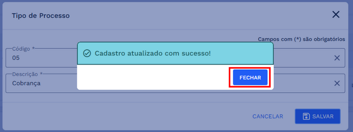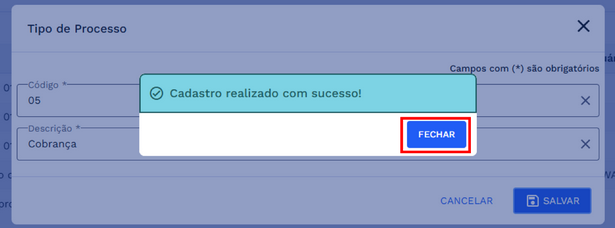 Clique em “FECHAR” para retornar para lista de tipos de processos.