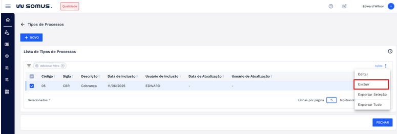 Para excluir um tipo de processo cadastrado, primeiro localize o registro desejado na lista. Em seguida, selecione o tipo de processo e clique no botão “Ações”.