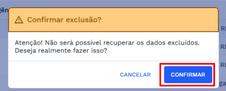 Para concluir a exclusão, clique em “CONFIRMAR”. Caso prefira cancelar o processo, clique em “CANCELAR”. Confira o exemplo na imagem abaixo: