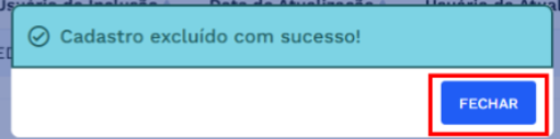 O sistema fará todas as validações necessárias, caso não exista nenhum impedimento para que a exclusão seja realizada, será exibida a caixa de diálogo de sucesso indicando que o cadastro foi excluído com sucesso.