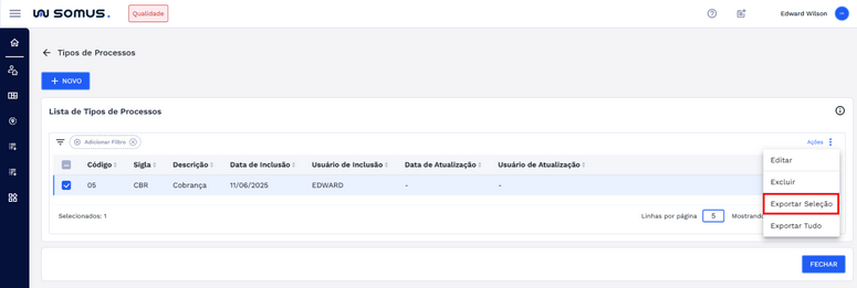 Para exportar registros específicos, selecione apenas um tipo de processo por vez na lista, marcando a caixa correspondente. Em seguida, clique no botão “Ações” e escolha a opção “Exportar Seleção”.
