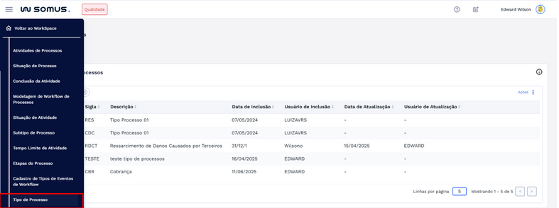 | Workflow | Visualizar lista dos tipos de processos cadastrados |