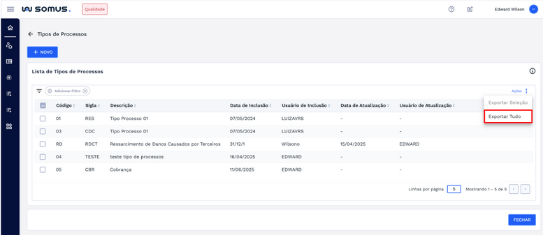 Na lista de tipos de processos, é possível exportar os dados disponíveis para um arquivo, facilitando consultas externas ou registros fora do sistema. Há duas opções de exportação: