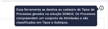 Info: O símbolo ⓘ no card da lista de tipos de processos indica a presença de informação complementar. Ao passar o cursor sobre o ícone, o sistema exibe orientações úteis sobre a seção correspondente.