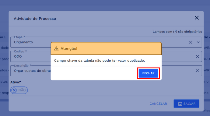 Ao tentar salvar um tipo de processo com um valor já existente no campo chave (por exemplo, o Código), o sistema impedirá a operação e exibirá uma mensagem de alerta como forma de validação: