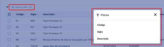 Adicionar Filtro: Ao clicar em Adicionar Filtro, são exibidas as opções de filtros disponíveis para a tabela. Após preencher os valores e confirmar, o filtro é aplicado e a lista é atualizada conforme os critérios informados.