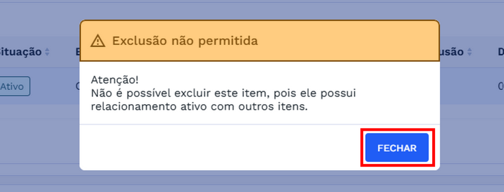 Nesses casos, ao confirmar a exclusão, será exibida a seguinte mensagem de validação: