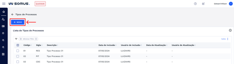 Para iniciar, clique no botão "+ NOVO" para incluir um tipo de processo.