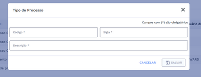 Ao clicar no botão “+ NOVO”, a janela de cadastro do tipo de processo será carregada com os campos em branco, pronta para o preenchimento.