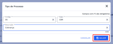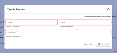 Quando os campos forem preenchidos, o botão “SALVAR” será habilitado para finalizar o cadastro. Caso deseje cancelar a operação, clique em “CANCELAR” para retornar à lista de tipos de processos sem salvar as informações.