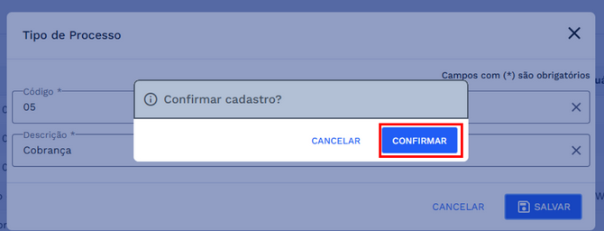 Clique em “SALVAR”, na sequência o sistema apresentará uma caixa de diálogo solicitando a confirmação do cadastro, para avançar clique em “CONFIRMAR” e caso deseje retornar clique em “CANCELAR”, confira na imagem abaixo: